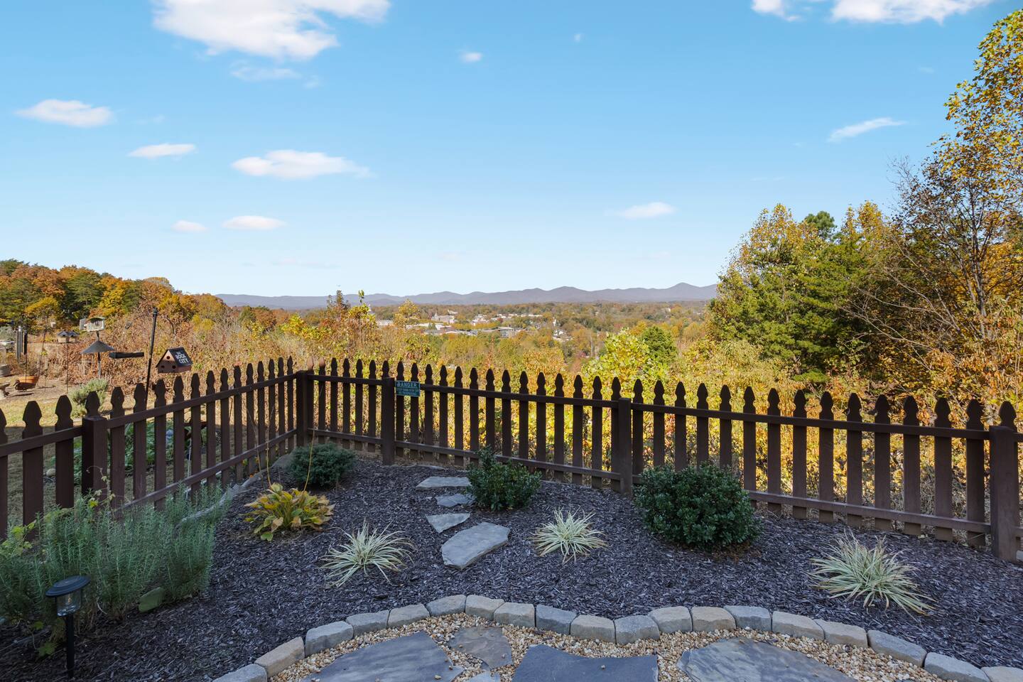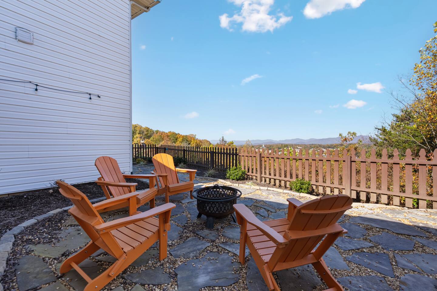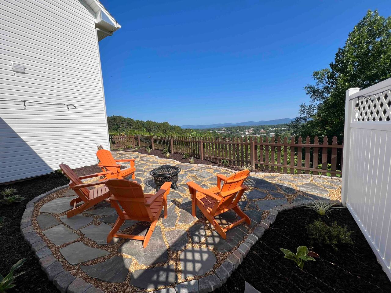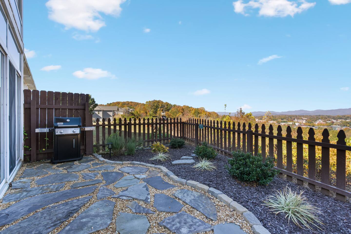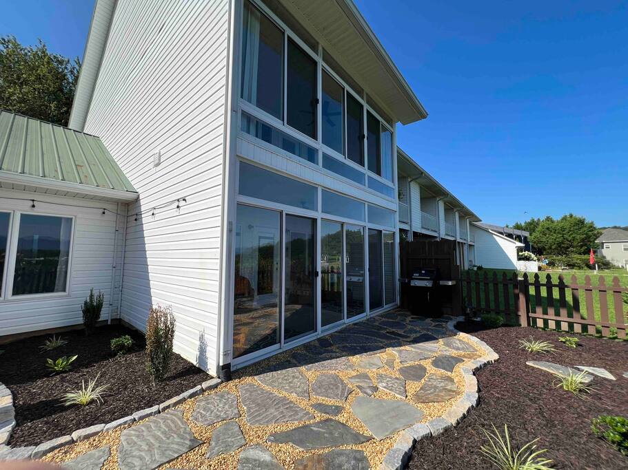 The townhouse is an end unit so you have a private parking, entrance and back yard. The backyard has a gas grill and seating around the firepit with an amazing view!