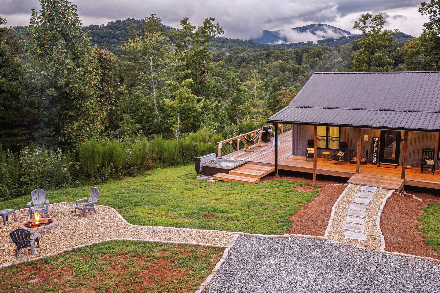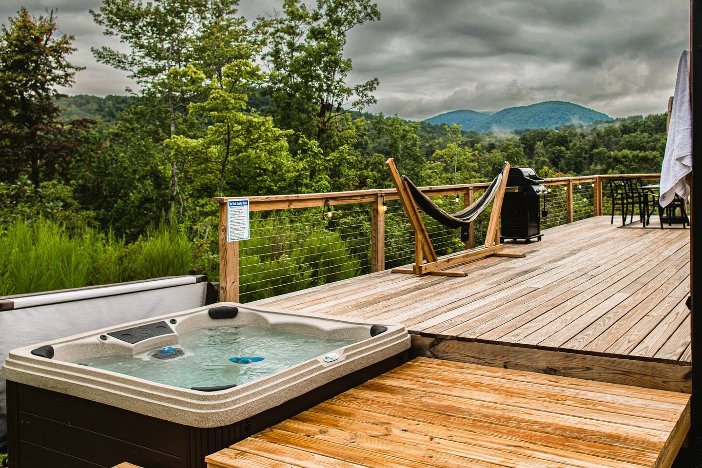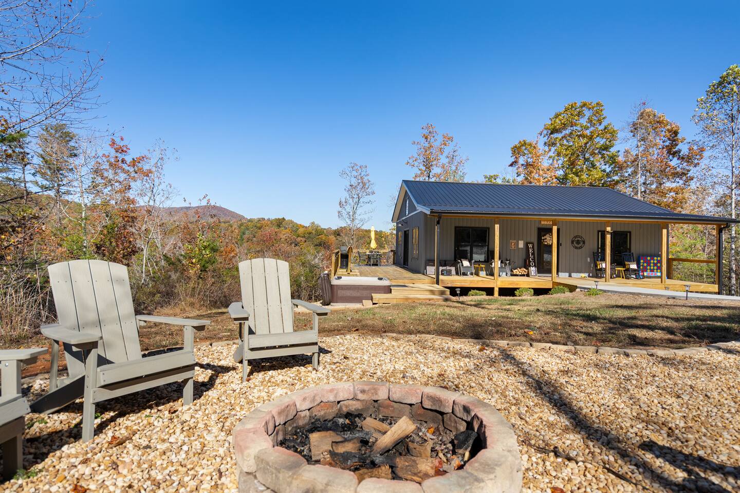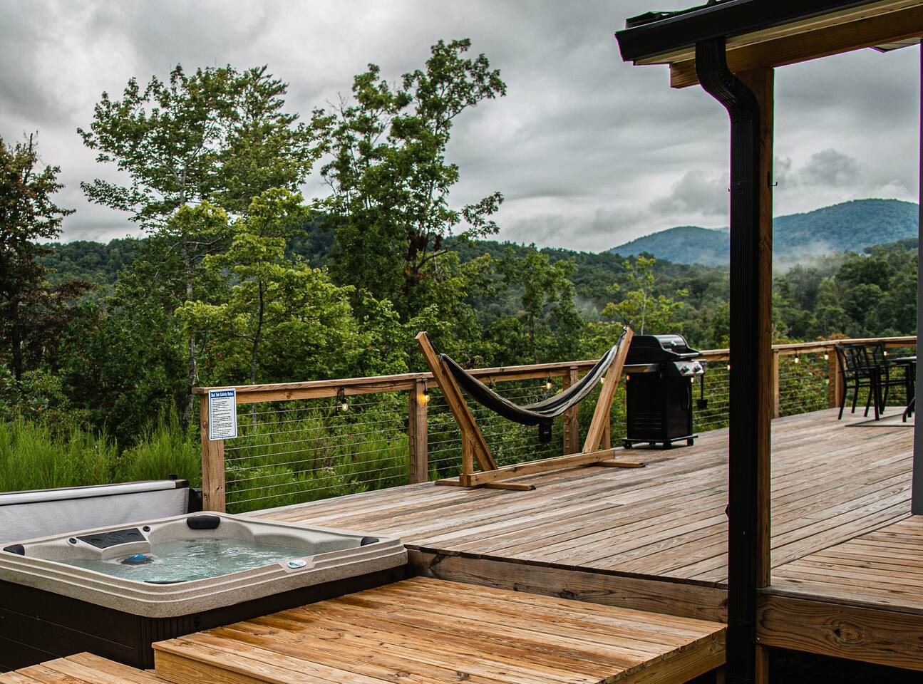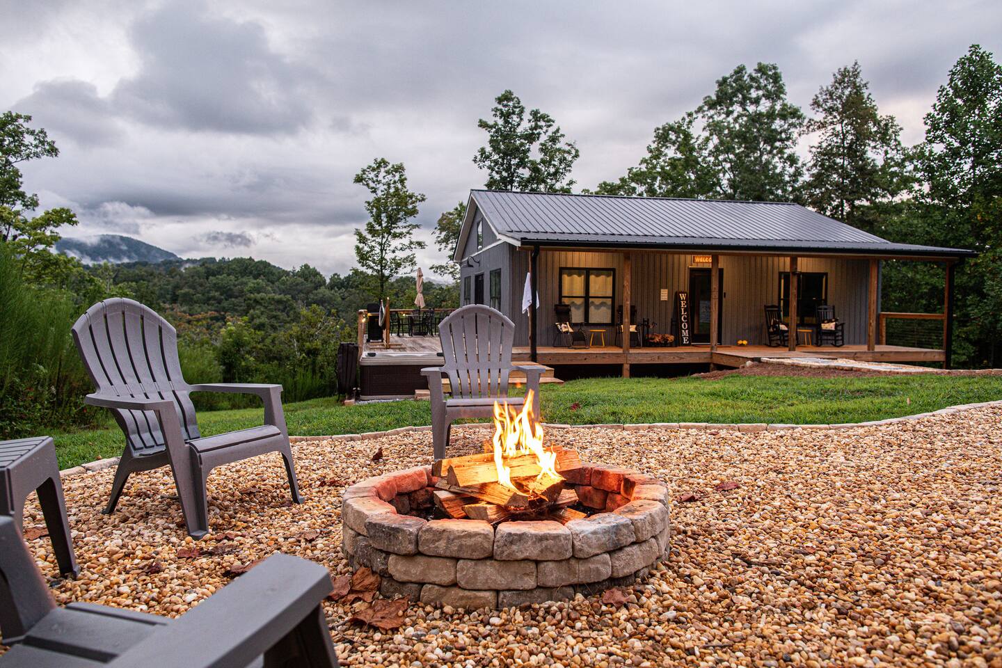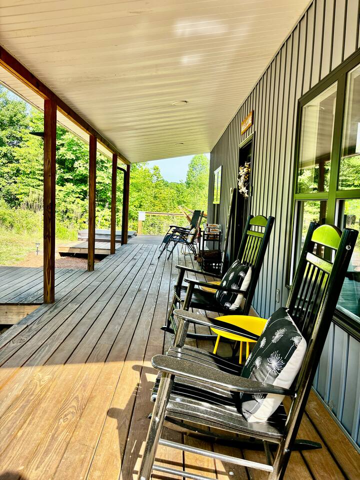 Hot tub, Large covered porch, Large open deck with view, Rocking chairs, Zero gravity chairs, Hammocks, Fire pit, Stocked kitchen, Walking trails, Wildlife, Privacy and more!