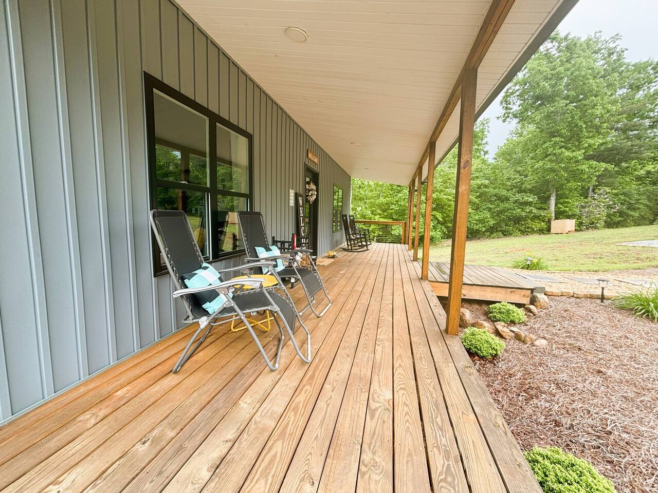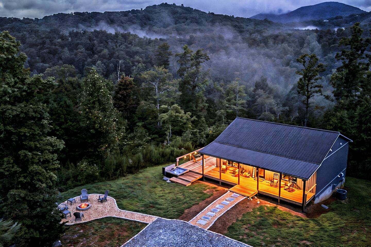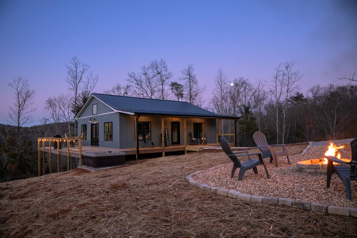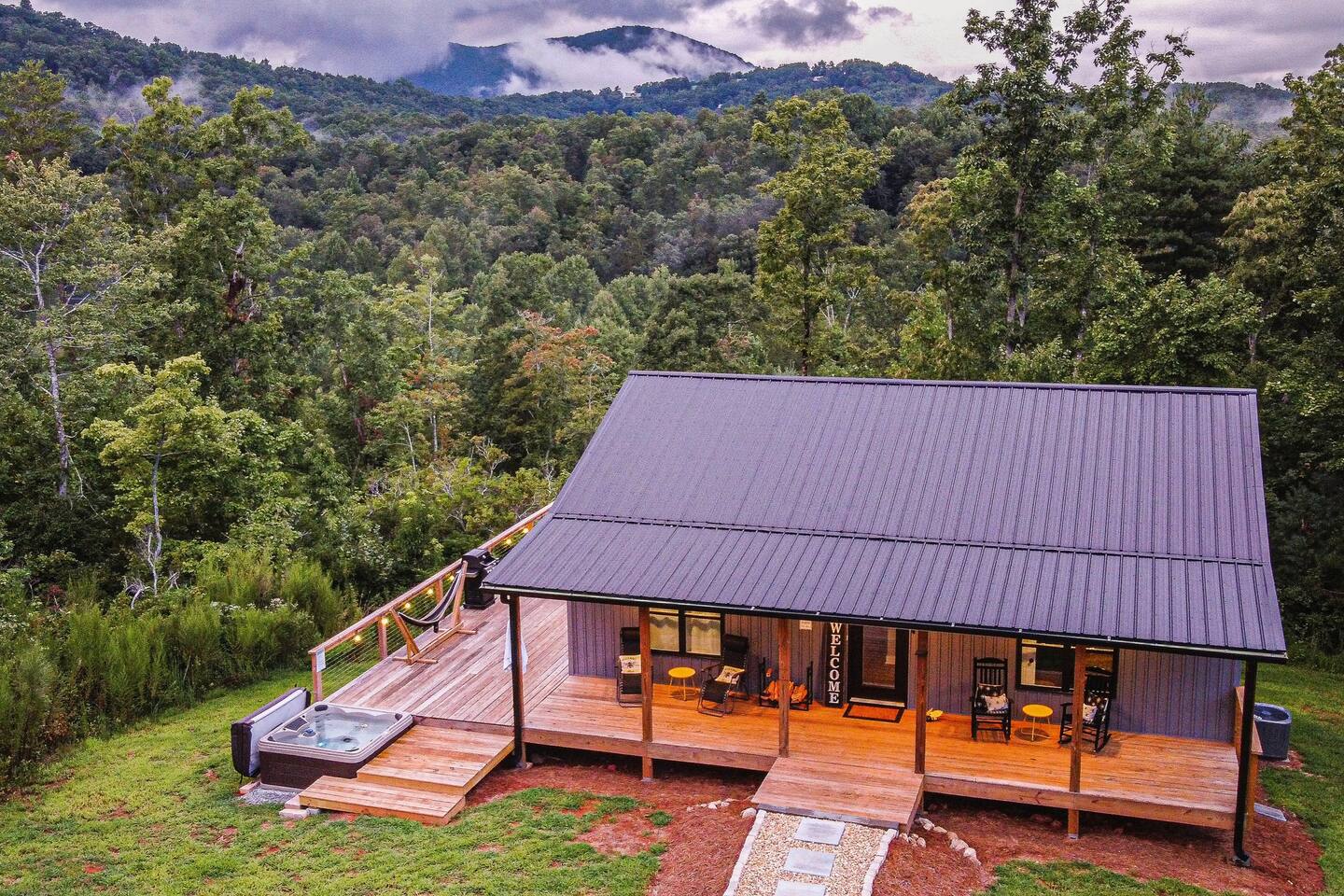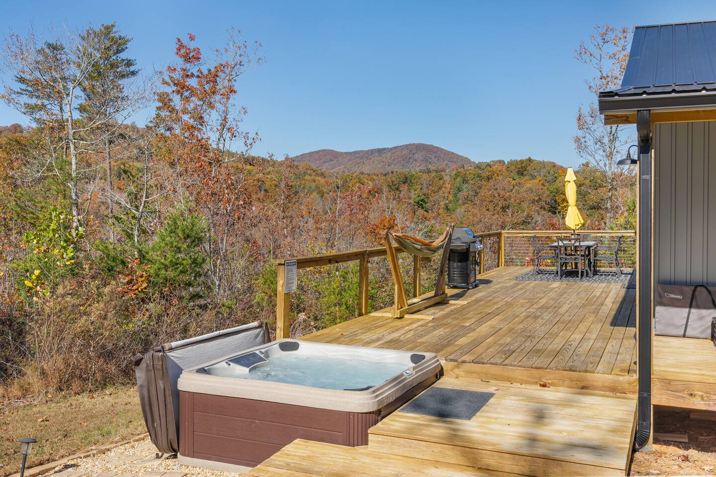 Hot tub, Large covered porch, Large open deck with view, Rocking chairs, Zero gravity chairs, Hammocks, Fire pit, Stocked kitchen, Walking trails, Wildlife, Privacy and more!