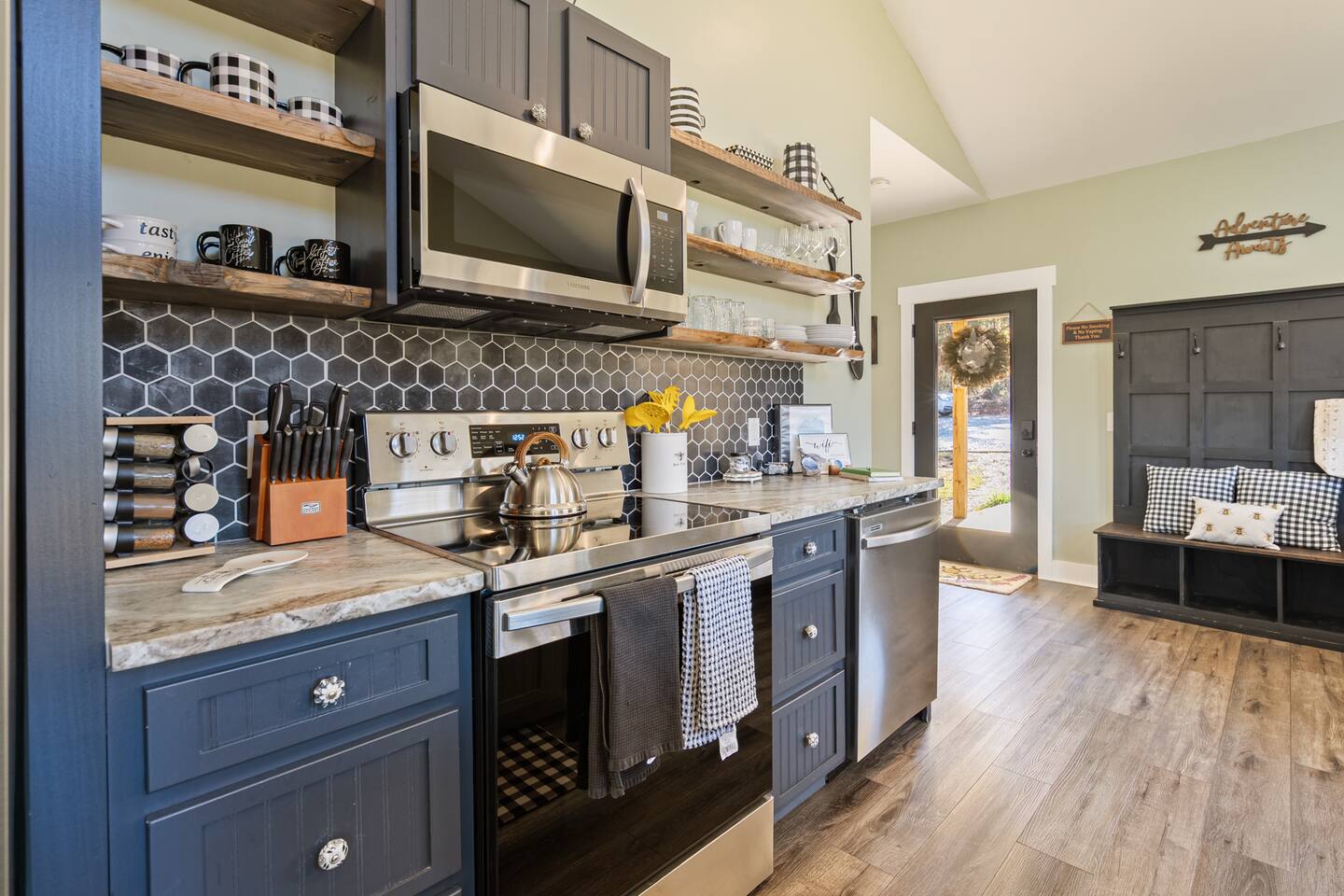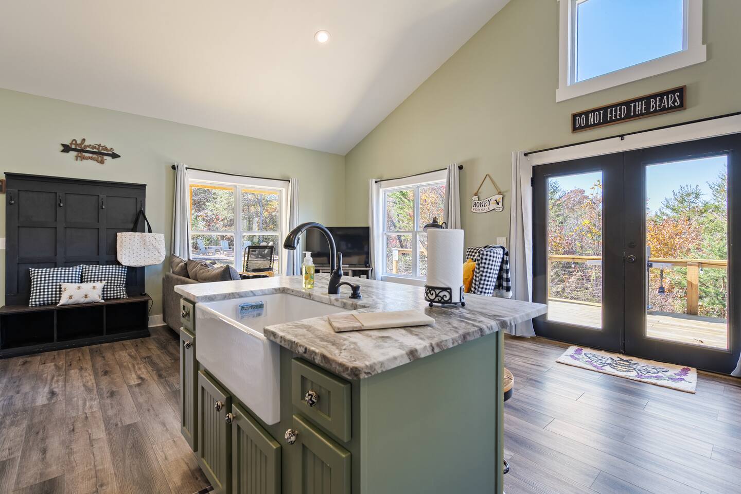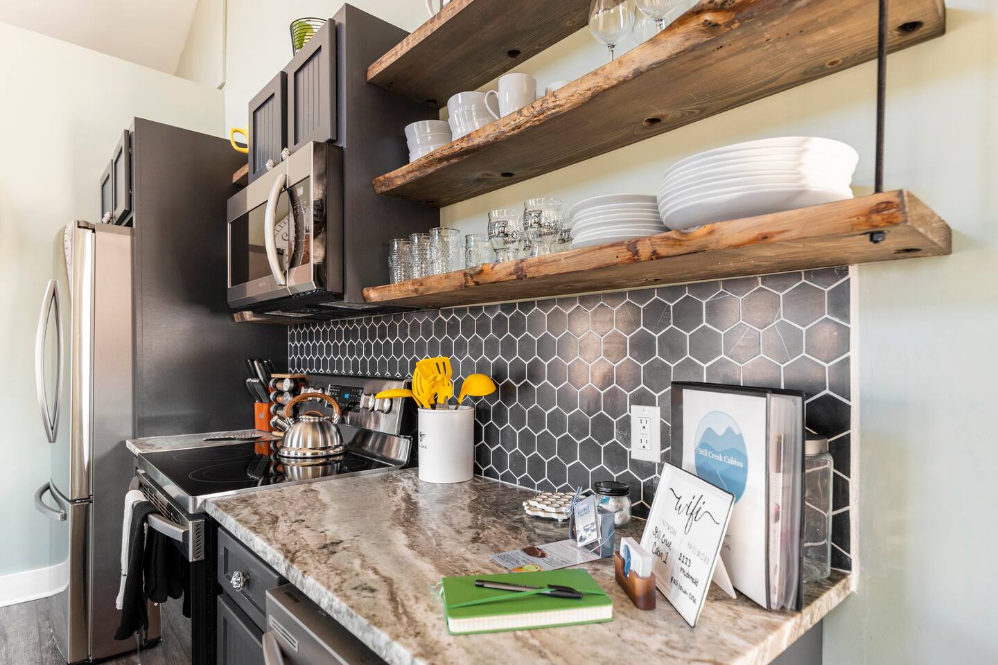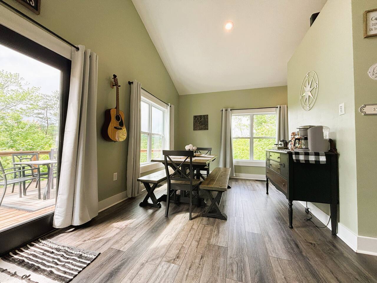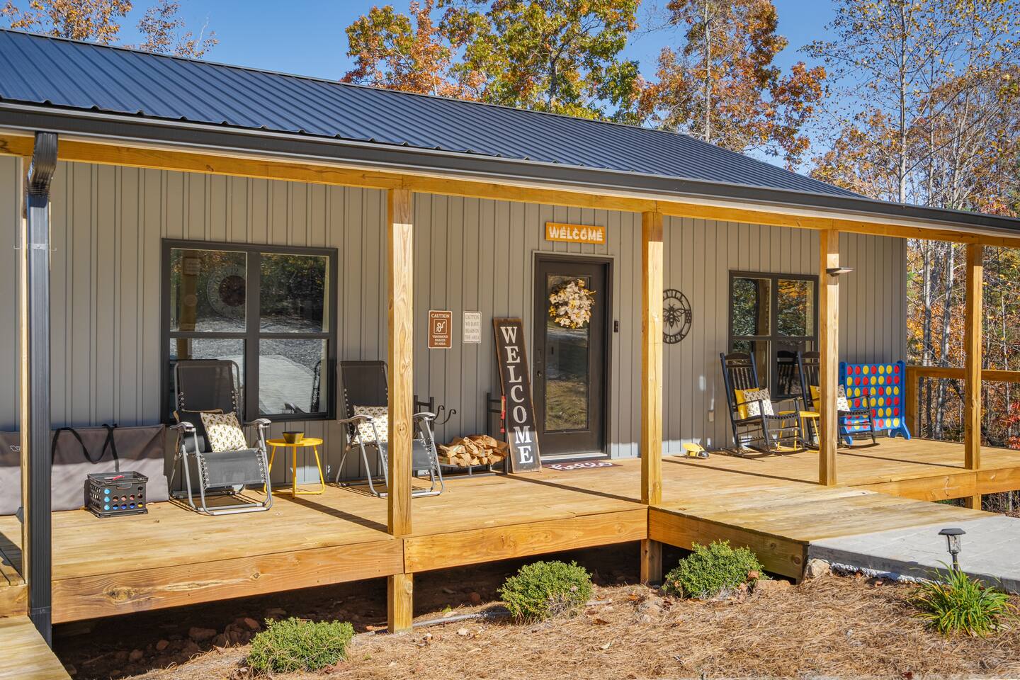 Hot tub, Large covered porch, Large open deck with view, Rocking chairs, Zero gravity chairs, Hammocks, Fire pit, Stocked kitchen, Walking trails, Wildlife, Privacy and more!